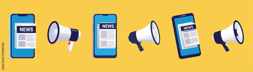 A series of smartphone illustrations displaying news headlines, each accompanied by a megaphone, set against a yellow background #1798867289