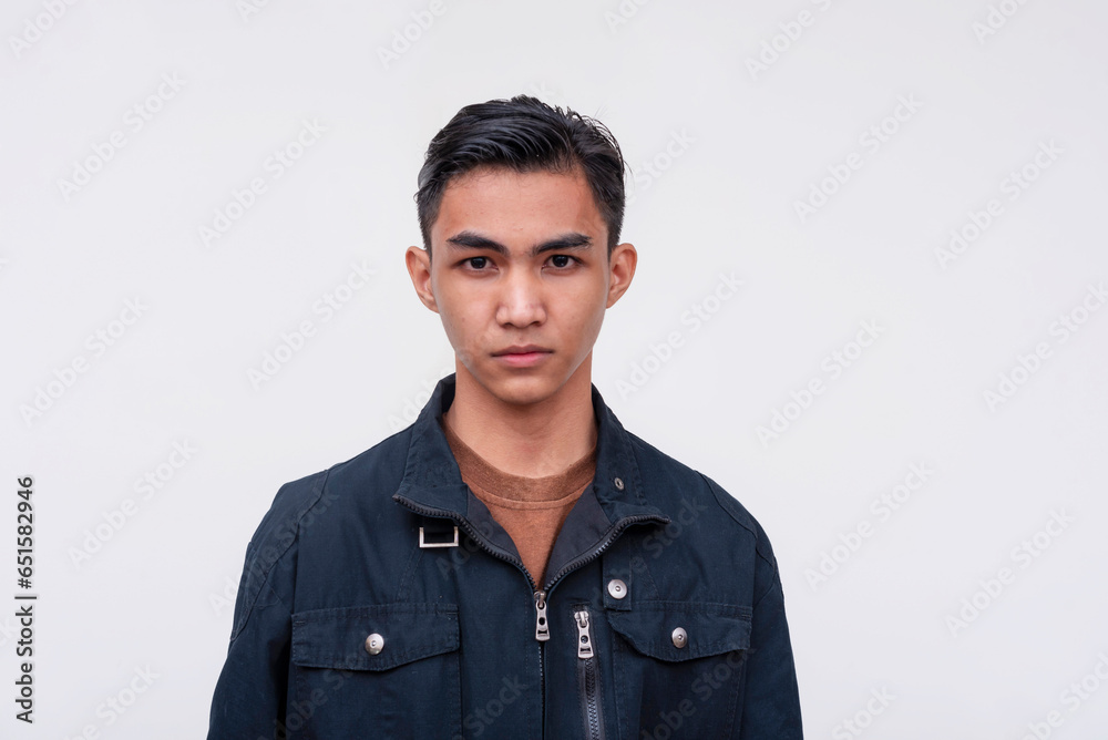 A serious young Filipino teen in a black jacket, jeans and white sneakers. Isolated on a white background. #651582946