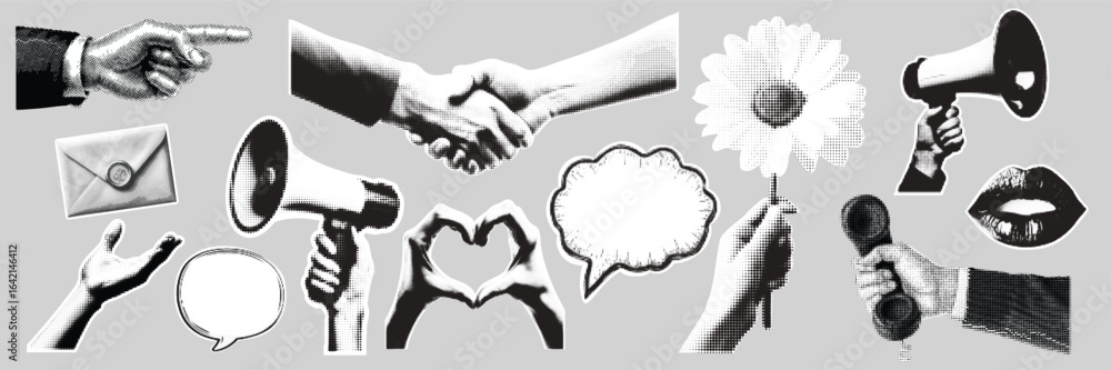 A set of balck and white cut out elements of a halftone collage. Contemporary minimalistic marketing and business style. Ready to use elements for your designs.s #1642146412