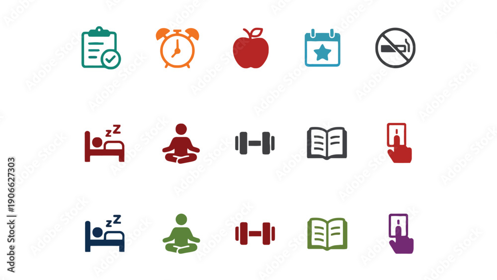 A set of colorful icons illustrating healthy lifestyle habits and daily routines #1906627303
