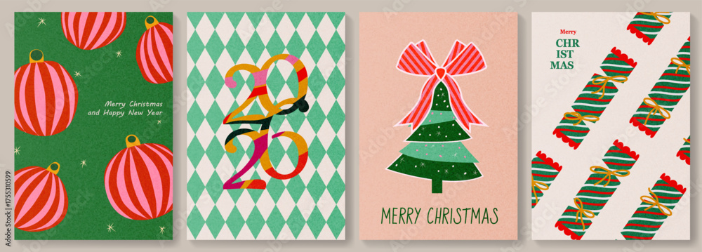 A set of hand-drawn Christmas and New Year 2026 cards in a modern style with Christmas tree decorations, candies, Christmas tree, gifts for decorating, covers, posters, invitations #1755310599