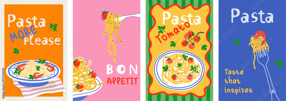 A set of minimalist posters featuring Italian pasta. More pasta, please. Bon appetit. Poster with pasta, shrimp, greens, and tomatoes for the kitchen, cafe, background, wall poster. #1777542510
