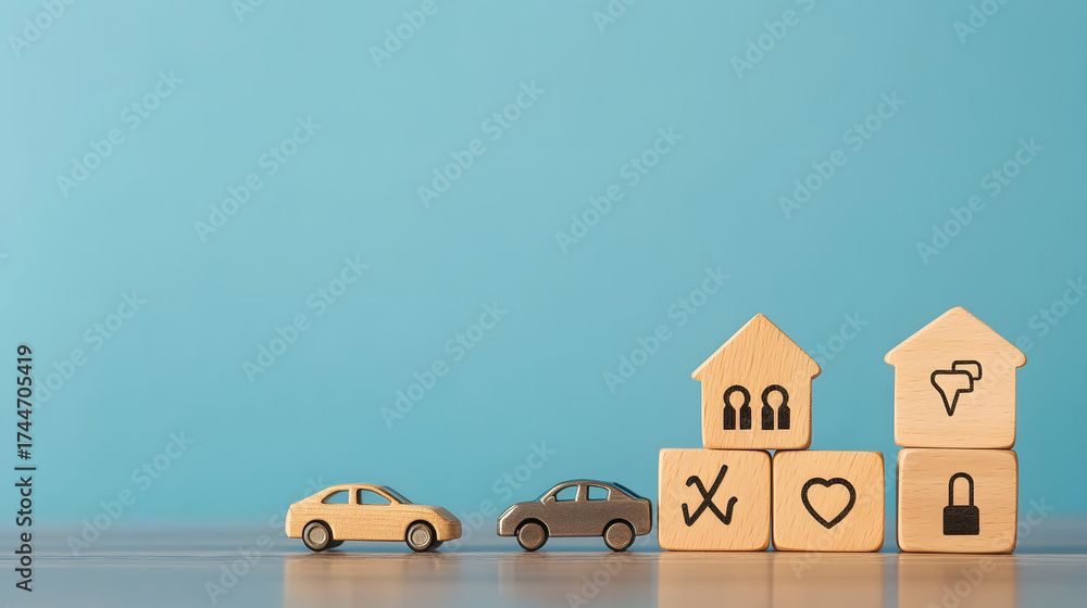 A set of wooden blocks displaying insurance icons for family, life, car, travel, health, and home insurance, placed against a blue background with copy space. #1744705419