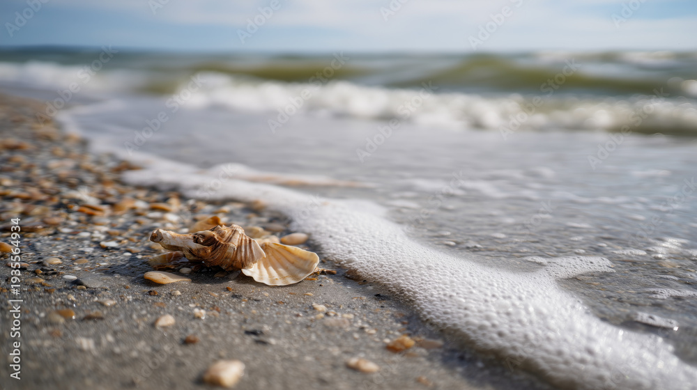 A shell is laying on the beach next to the water #1935564934