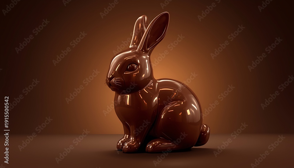 A shiny chocolate Easter bunny sitting on a brown surface with a warm background #1915500542