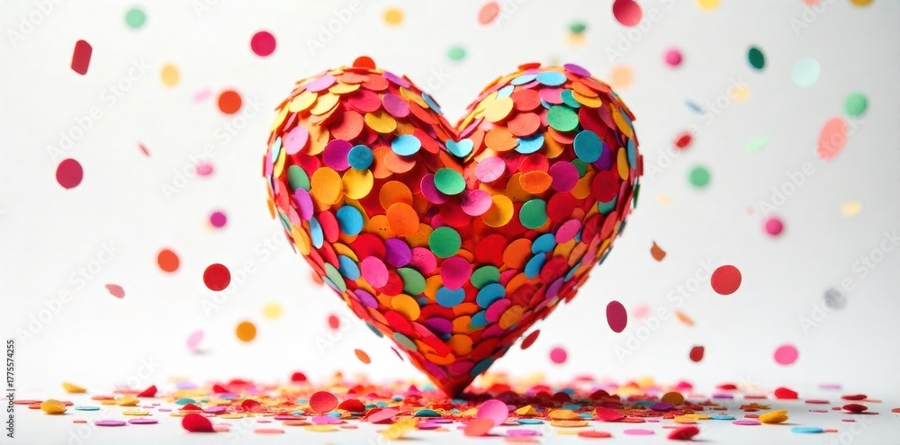 A shower of large, flat confetti falling and creating a dispersed heart silhouette on a white surface. A gentle shower of large, flat, colorful confetti pieces falling and creating a dispersed, soft #1775574255