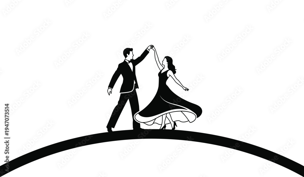 A silhouette of a man and a woman in formal attire gracefully dancing on a curved horizon line #1947073514