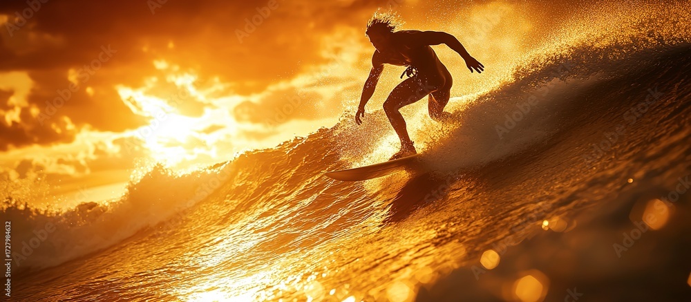 A silhouetted surfer enjoys riding a large wave at sunset #1727984632