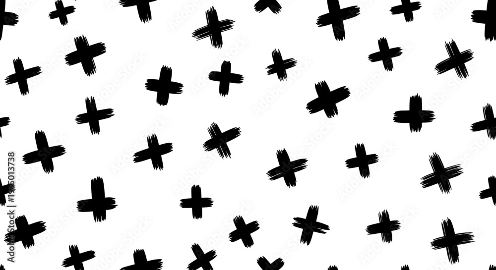 A simple, abstract pattern of scattered black hand-drawn plus signs on a clean white background, creating a minimalist and modern design. #1915013738
