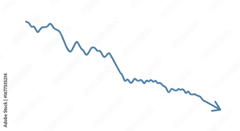 A simple blue line graph with a downward-pointing arrow illustrates a significant and steady decline representing a business recession stock market crash or financial loss. #1677335214