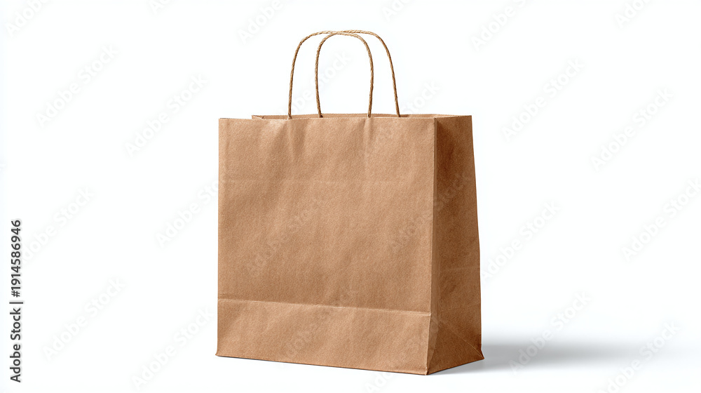 A simple brown paper shopping bag with handles, ready for carrying goods or presents #1914586946