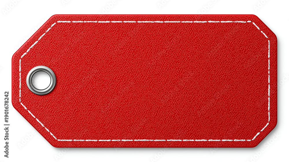 A simple, red label tag featuring a white stitch outline, perfect for branding, pricing, or organizing items effectively. #1901678242