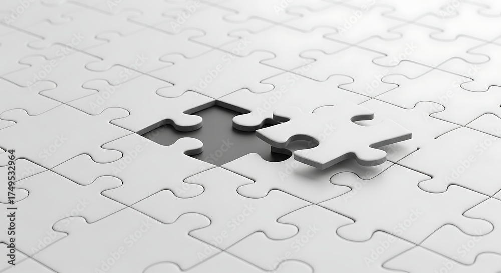 A single white jigsaw puzzle piece rests partially detached from a completed puzzle highlighting a missing element and the concept of incompleteness or a solution #1749532964