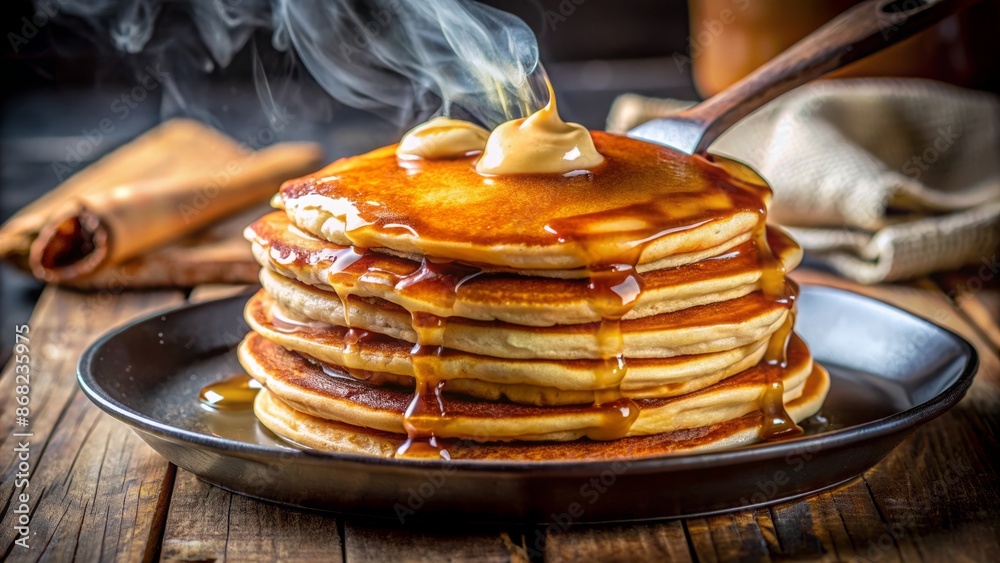 A sizzling griddle overflowing with a golden brown heap of fluffy buttermilk pancakes, syrup dripping, steam rising, utterly tantalizing. #868235975