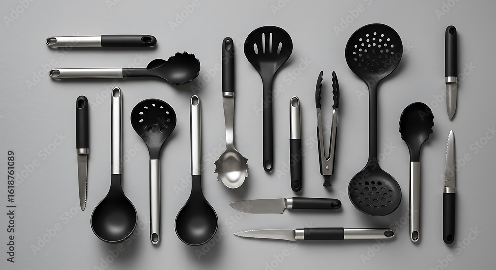 A sleek and modern flat lay of essential kitchen utensils, meticulously organized in a knolling style on a clean gray background #1618761089