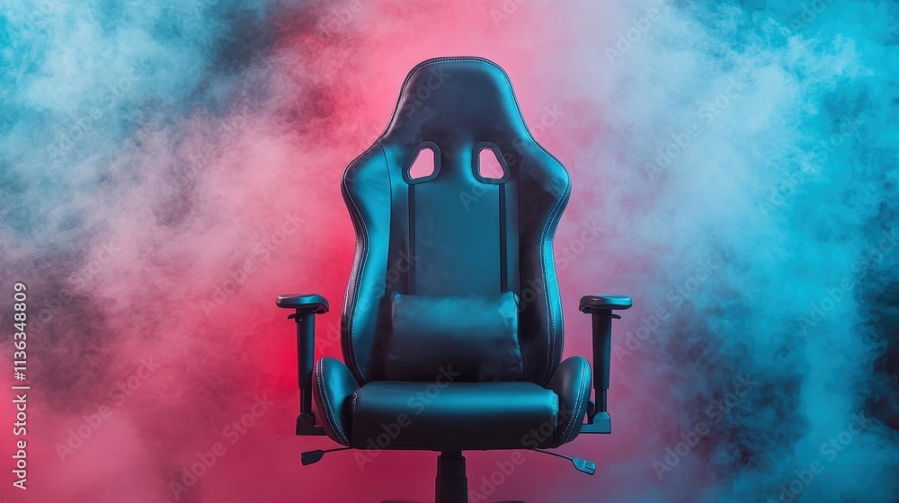 A sleek black gaming chair is centered against a vibrant smoky background blending blue and red hues, creating a dynamic and modern look perfect for gaming setups. #1136348809