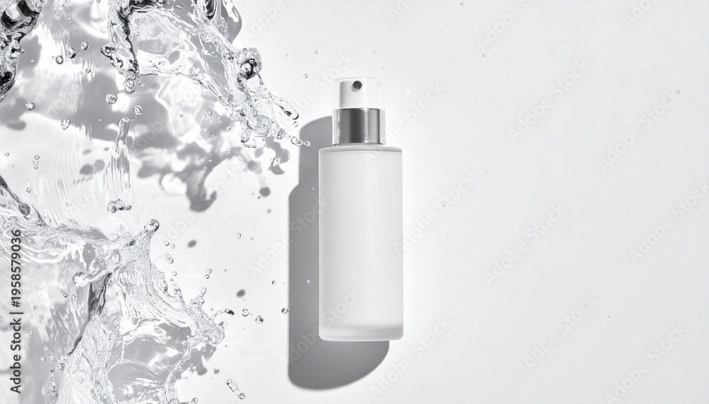 A sleek cosmetic bottle with refreshing water splashes. The clear water creates dynamic movement, embodying freshness and purity #1958579036