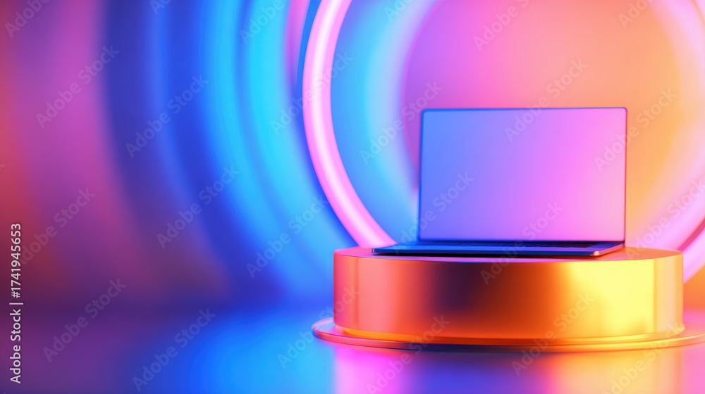 A sleek laptop on a vibrant podium surrounded by colorful neon lights, creating a futuristic ambiance #1741945653