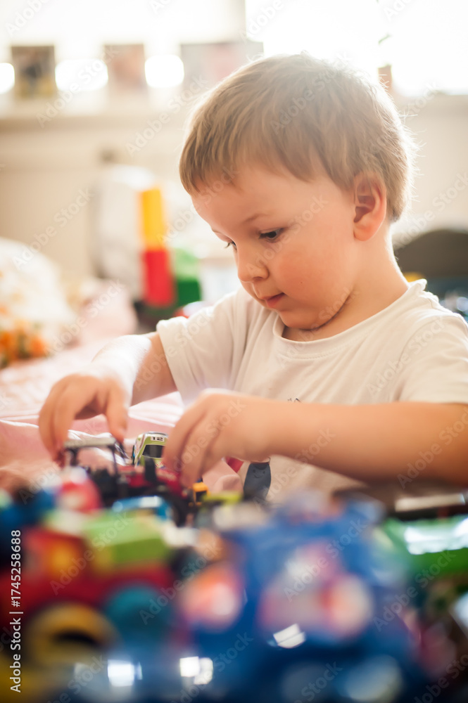 A small child concentrates on playing with a variety of colorful toy cars scattered around him in a lively room filled with light and toys. #1745258688
