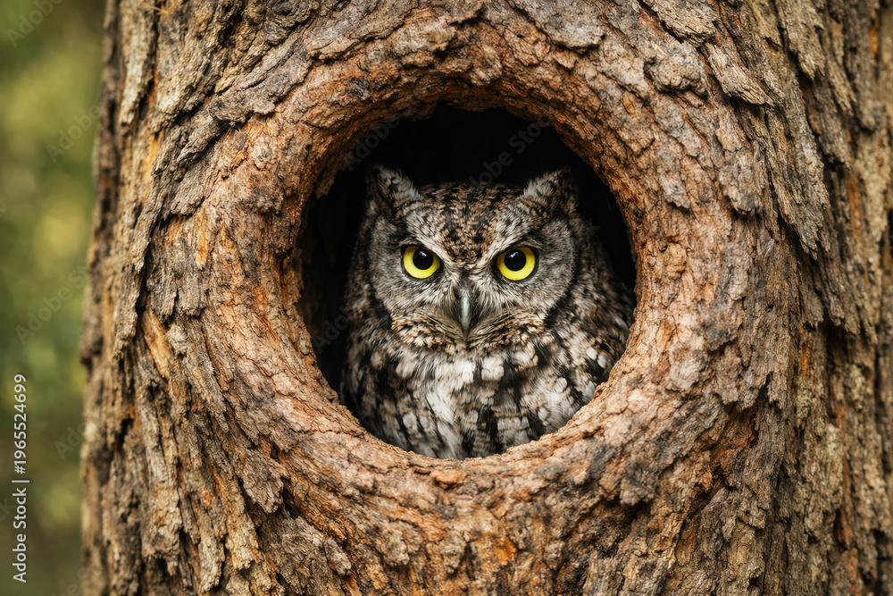 A small owl peers out from a natural hollow in a tree trunk. #1965524699