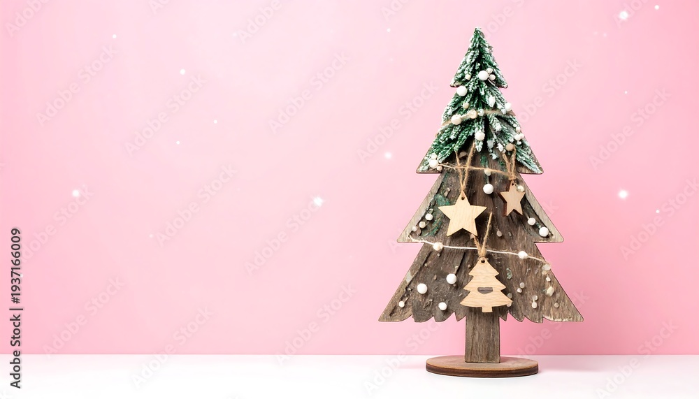 A small wooden Christmas tree decor sits on a white surface against a light pink background with bokeh lights #1937166009