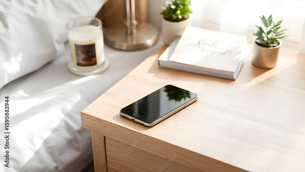 A smartphone on a nightstand next to a bed, a candle and plants are visible #1595883944