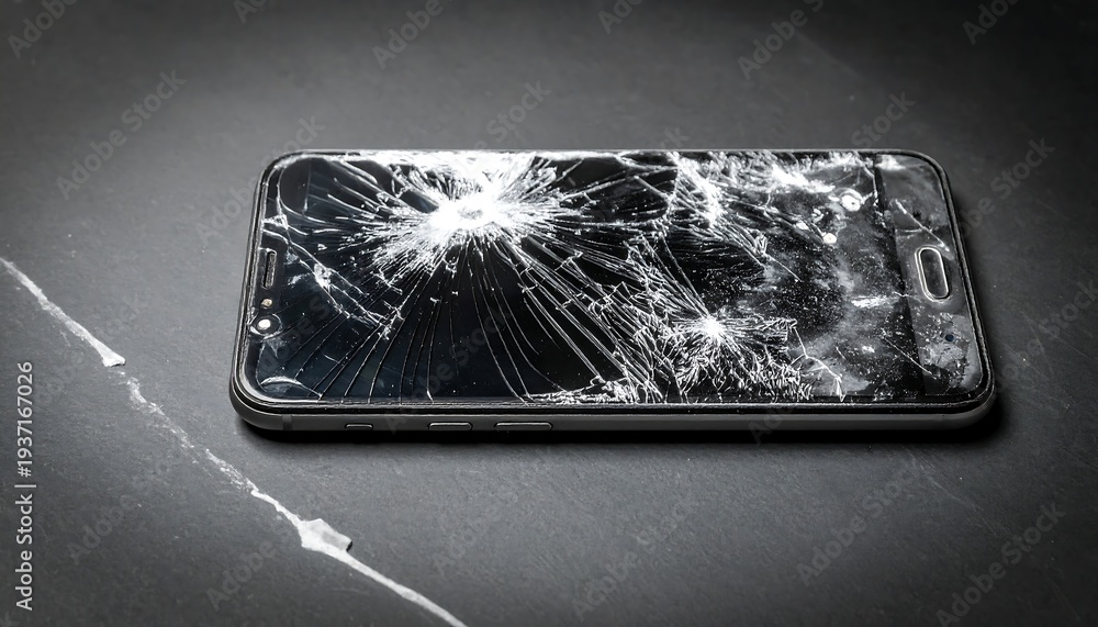 A smartphone with a dramatically shattered screen, lies on a dark, textured surface under bright light #1937167026