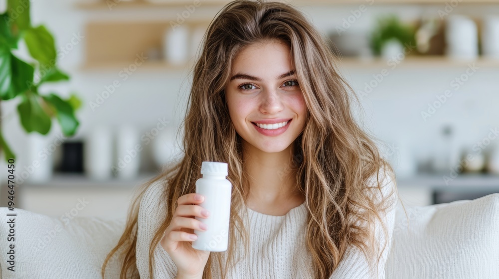 A smiling woman holds a vitamin bottle, showcasing health and wellness in a cozy, bright living space. #946470450