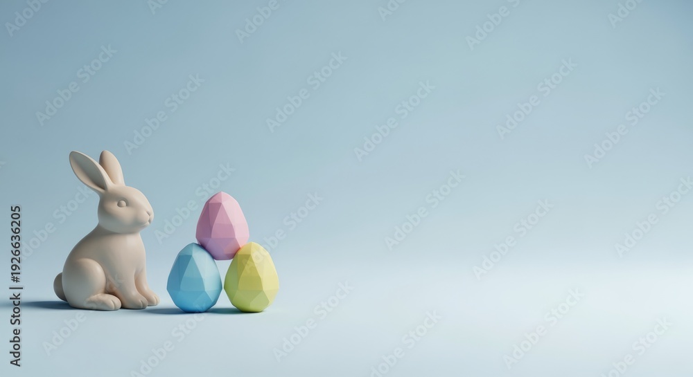 A soft, beige bunny sits beside three pastel-colored eggs in pink, blue, and yellow. The background is a light blue, creating a calm, festive atmosphere. #1926636205