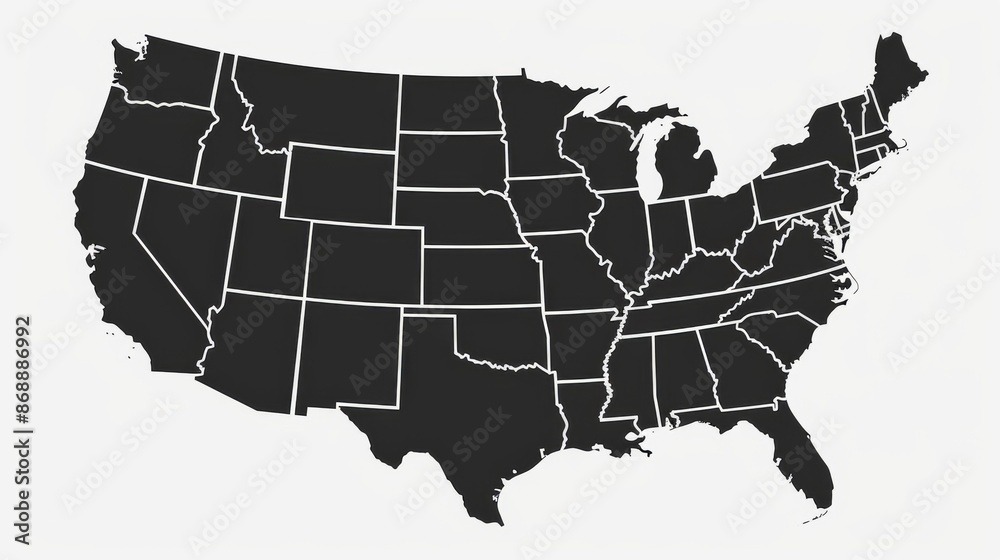 A solid black map featuring the United States with clearly outlined state borders, providing a bold and distinct representation of the entire country. #868886992