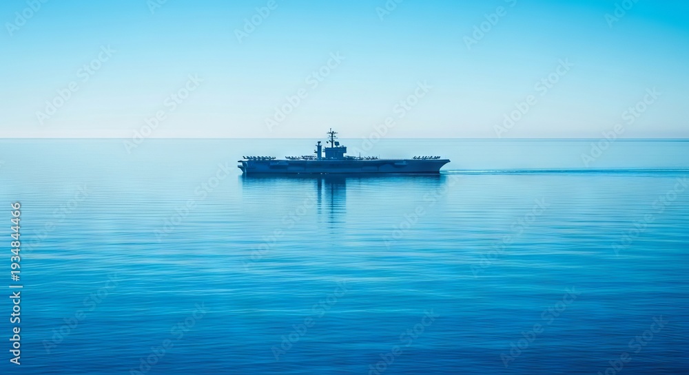 A solitary aircraft carrier glides across the immense, tranquil blue ocean under clear skies. A powerful vessel on an endless sea, military, strategic, simple #1934844466