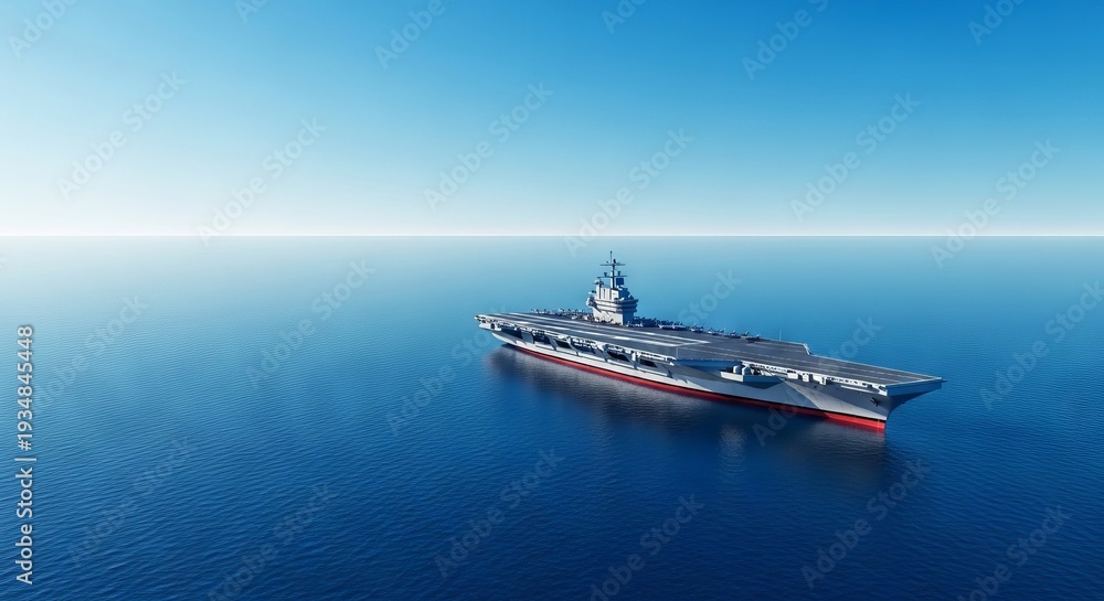A solitary aircraft carrier glides across the immense, tranquil blue ocean under clear skies. A powerful vessel on an endless sea, water, ocean, ship #1934845448