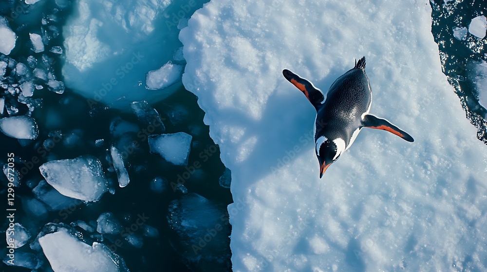 A solitary penguin standing on a floating ice sheet surrounded by crystal-clear turquoise water and scattered ice chunks, captured from above, showcasing the stark contrast of colors and the serene #1299672035