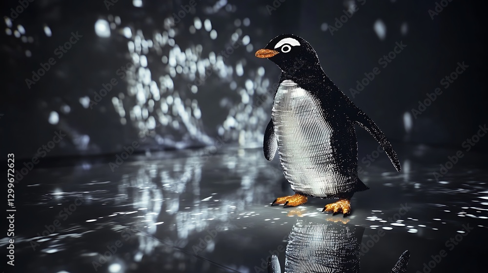 A solitary penguin standing on a reflective surface illuminated by soft, scattered light projections, creating a serene atmosphere #1299672623
