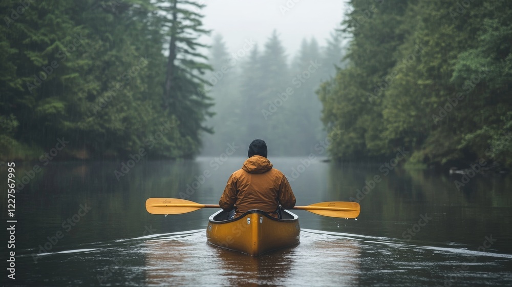 A solo canoeist paddling down a quiet river, surrounded by dense trees and calm waters. The peaceful atmosphere of the scene invites the viewer to enjoy the solitude of nature #1227567995