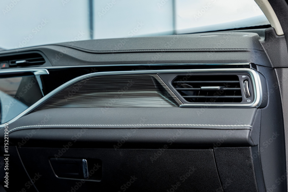 A sophisticated close-up of a modern vehicle's passenger-side dashboard, showcasing a multi-layered design #1752212902