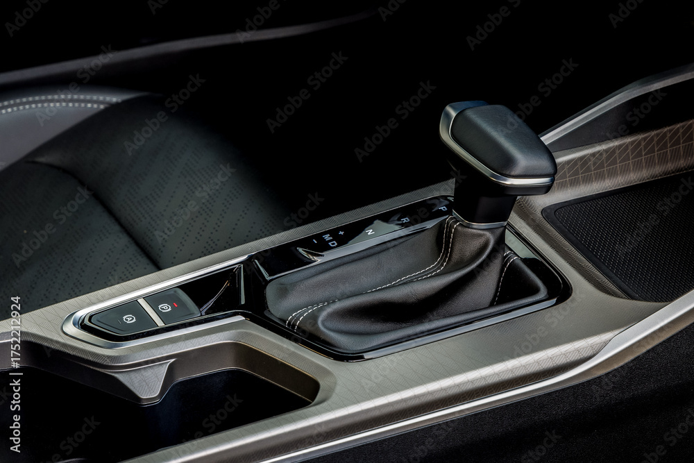 A sophisticated top-down perspective of a modern vehicle's transmission tunnel, highlighting a premium automatic gear selector with a leather-wrapped boot and contrast white stitching #1752212924