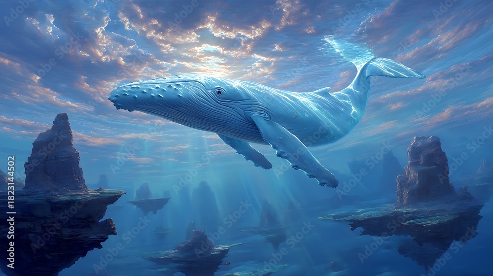 “A spirit whale made of pure water and light swimming through floating islands, surreal dreamlike scenery, fine art realism, 32K resolution #1823144502