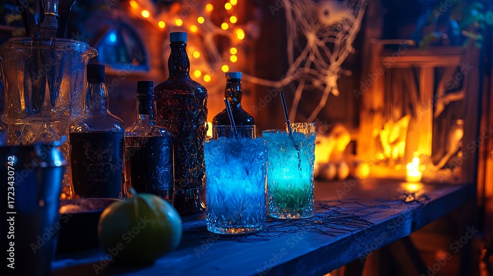 A spooky Halloween drink bar with haunted decorations and eerie glowing drinks . #1723430742
