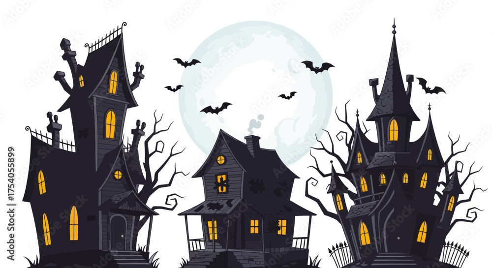 A spooky Halloween illustration of three haunted houses silhouetted against a large full moon with flying bats. #1754055899