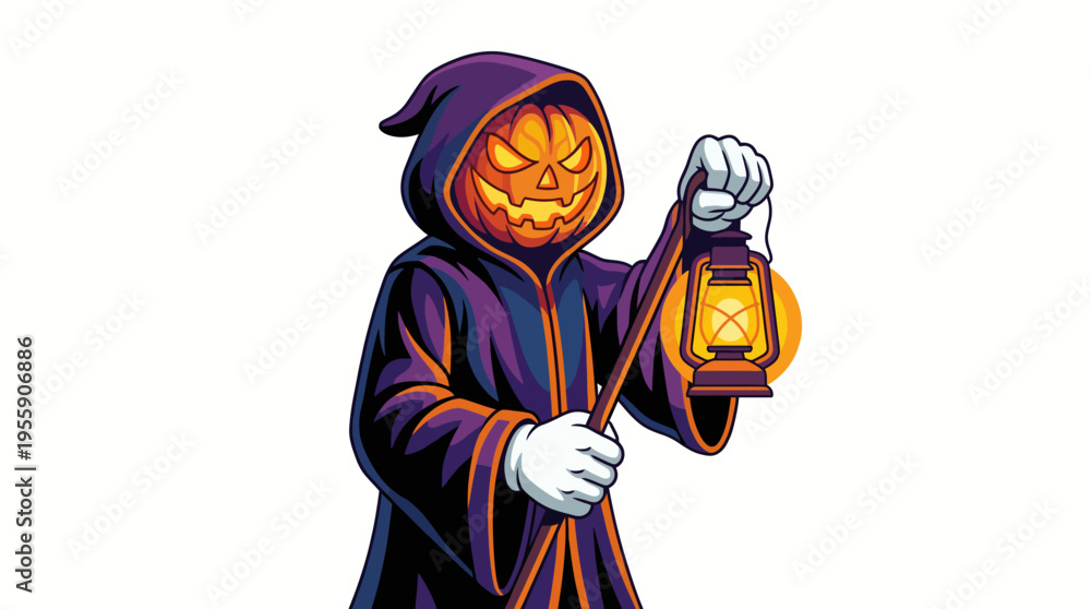 A spooky pumpkin character clad in a hooded robe holds a lantern, representing the essence of Halloween with a whimsical touch of charm and fright. #1955906886