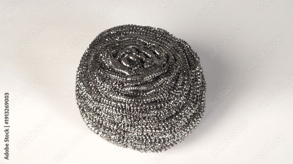 a stainless steel scouring pad used for dishwashing on white background. #1913269003