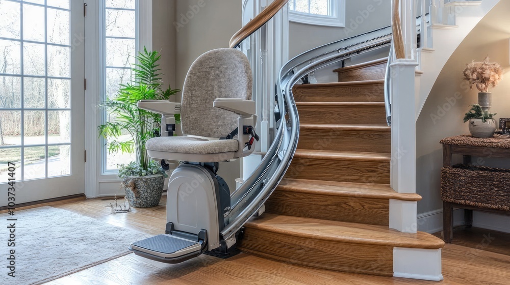 A stair lift on a modern spiral staircase, showcasing its versatility in different home designs. #1037341407