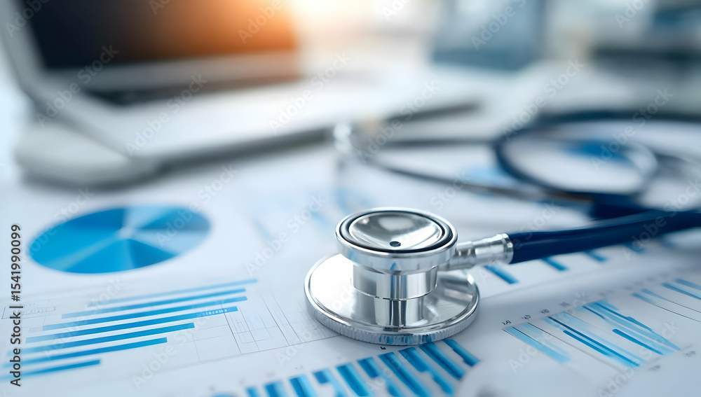 A stethoscope rests on financial documents beside a laptop, symbolizing the intersection of healthcare and finance. #1541990099