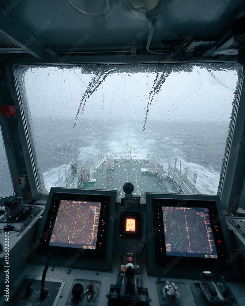 A stormy sea view from the ship's bridge, with rain streaks on the window, and navigation display #1956722570