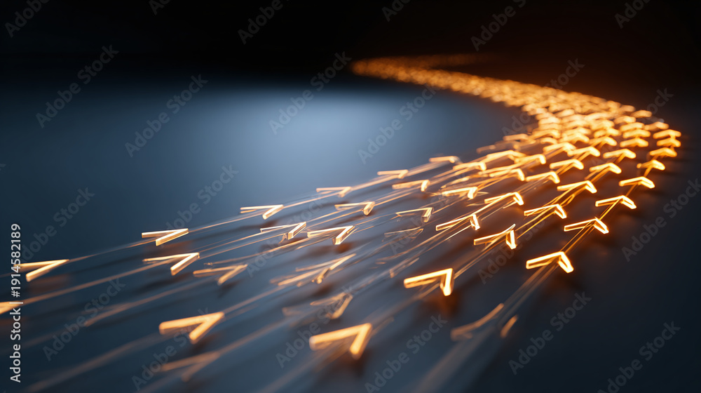A Stream of light arrows creating a path, concept of direction and progress. The arrows, radiating energy, depict the concept of going forward, journey, and process #1914582189