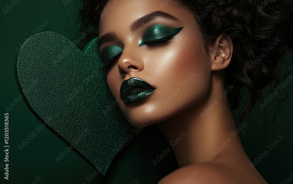 A striking beauty shot of a woman with deep emerald green eyeshadow and glossy lips, with a rich forest green heart background #1203518365