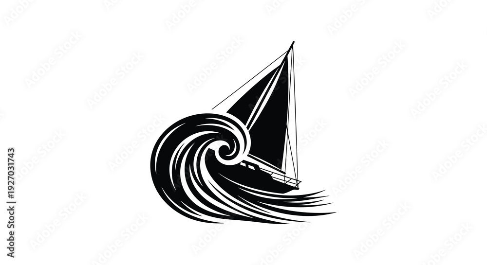 A striking black and white image depicts a sailboat navigating swirling waves showcasing a bold silhouette high quality #1927031743