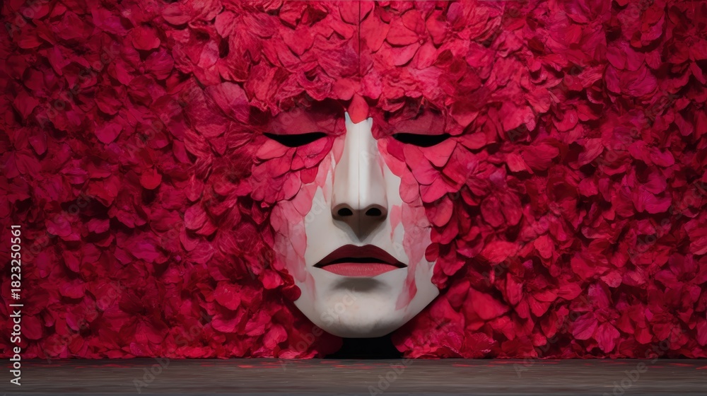 A striking mask adorned with vibrant red petals, creating a bold artistic expression that merges beauty and emotion. #1823250561