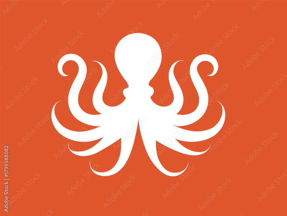 A striking white silhouette of an octopus is set against a bright orange background. The design highlights the octopus unique shape and tentacles, creating a lively contrast. #1739348082
